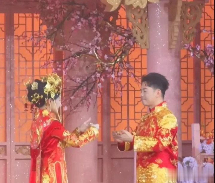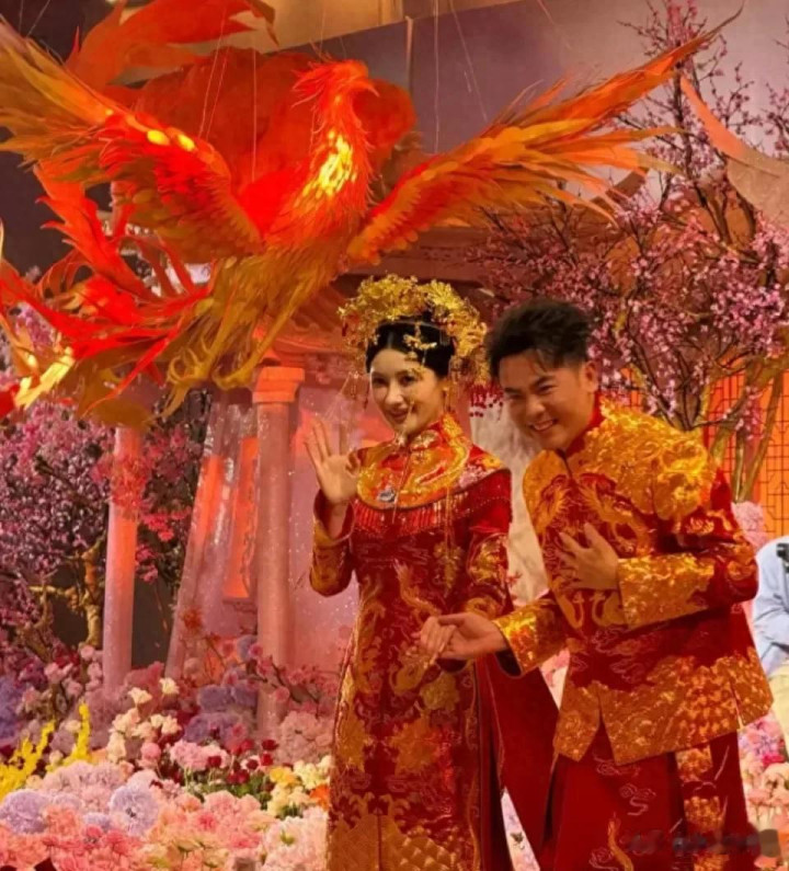 婚礼是中式的,新娘高海纯穿着传统的“凤冠霞帔”,和同样中式礼服的新郎张俊杰站在一起,真是郎才女貌。