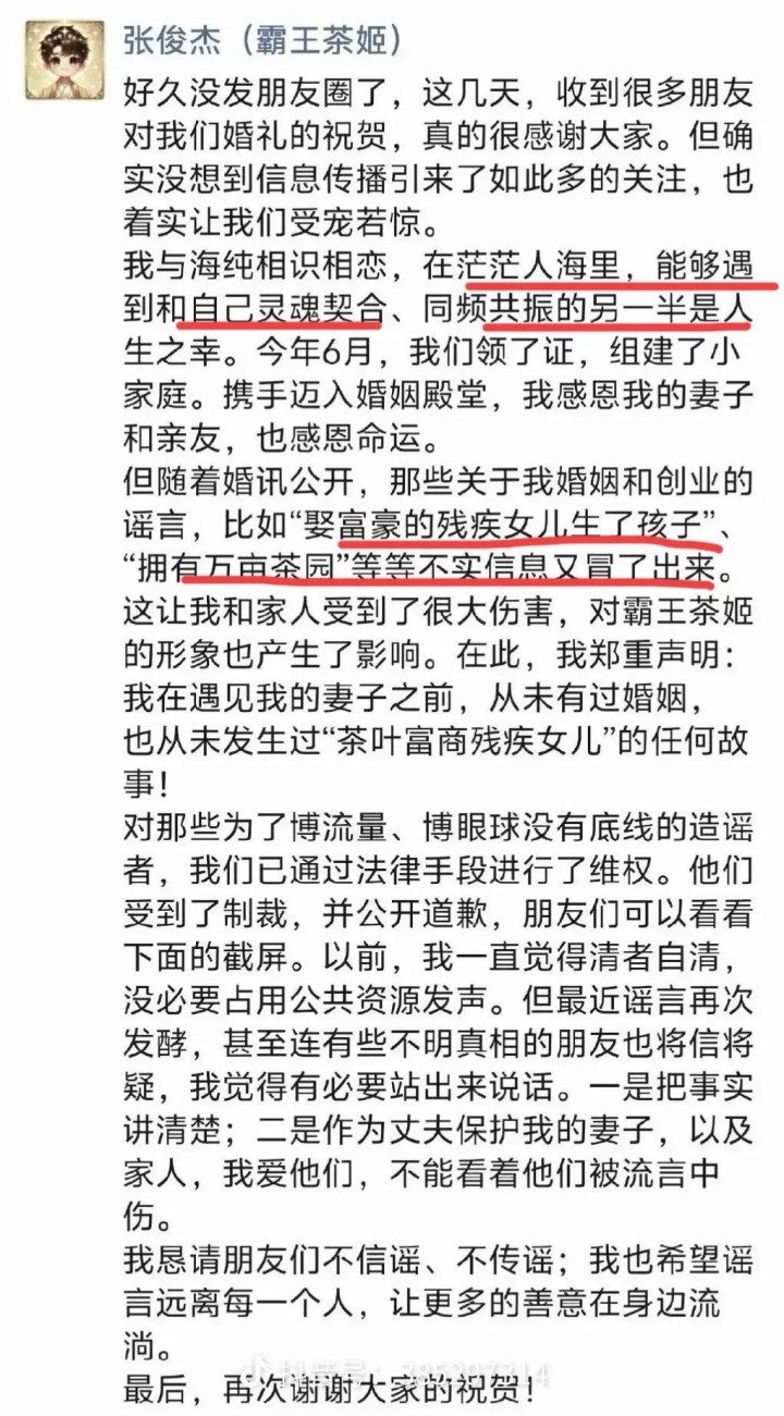 之前网上曾有传言,说他“娶了茶叶富商的残疾女儿生了孩子”,“继承了万亩茶园”。今年11月21日,张俊杰亲自在社交媒体上澄清:“在我遇见我妻子(高海纯)前,从未有过婚姻,也从未发生‘茶叶富商残疾女儿’的任何故事。”(你们看到过吗?反正我看过这个故事,当时还有“原来如此”的感慨。)