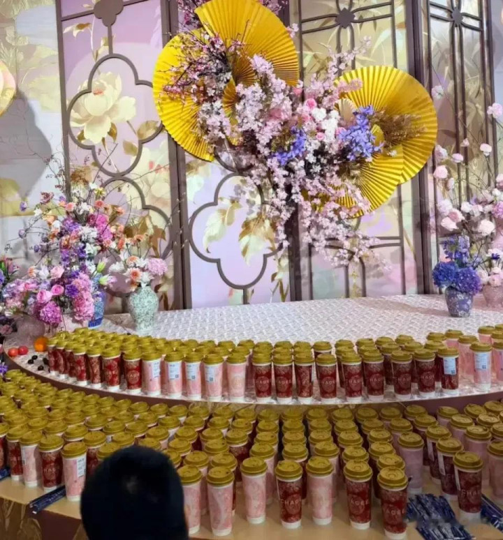 常州今天好多人朋友圈都是这场婚礼,好像大家都去。现场摆满了霸王茶姬的奶茶,不知道嘉宾们手里拿的是酒杯,还是一杯杯奶茶?